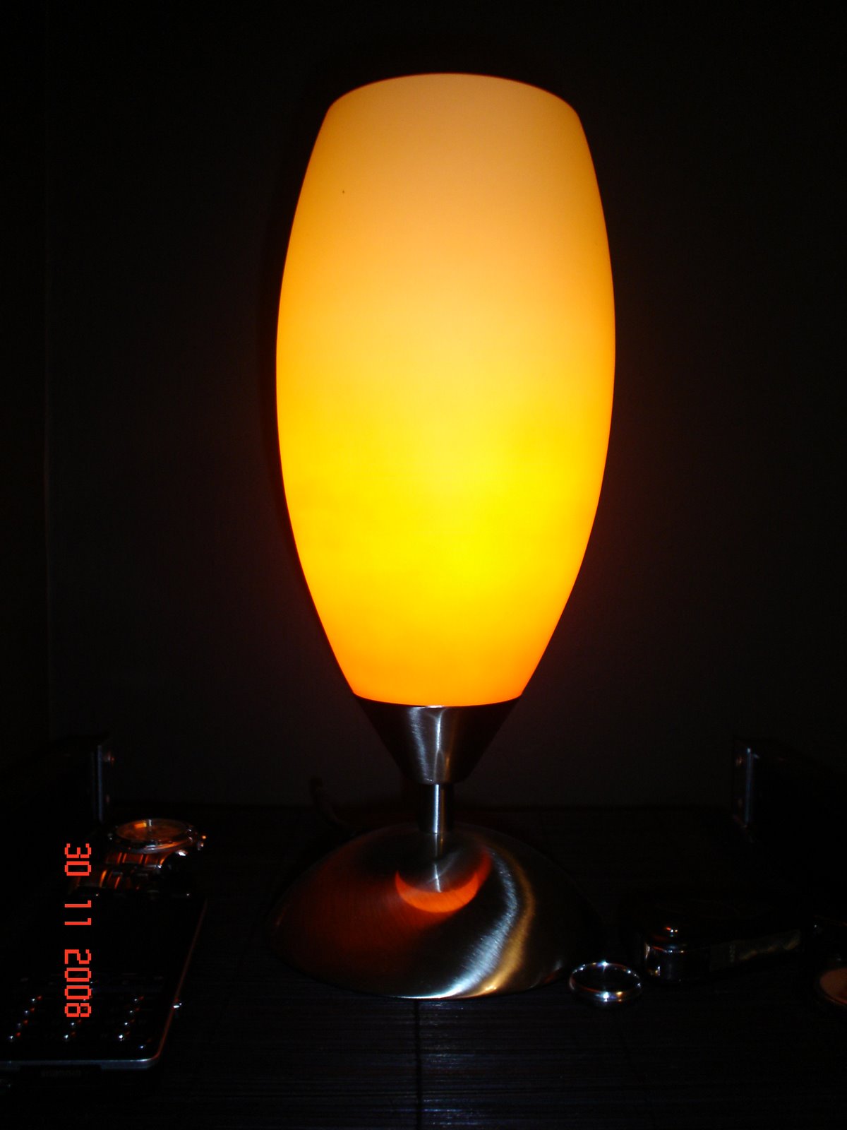 Un simple objet ne me suffisait pas, je nourrissais l'envie de reproduire une ambiance, un sentiment, un état. Une lampe de chevet, pourquoi pas? Sa forme se veut plus complexe qu'une table ou des chaises: celle-ci a dû être retravaillée maintes fois à l'aide de la technique de SubSurf (Subdivision surfaces) à partir d'une simple sphère de huit anneaux et huit segments. A force de subdiviser certaines parties et d'en reserrer d'autres, le résultat obtenu est assez joli au regard. Mais le plus important est que l'objet 3D créé est relativement proche de son modèle d'origine: une lampe de chevet posée près de mon lit...